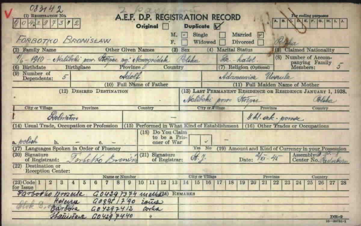 according to his DP2 card: „Naliboki, powiat Stołpce, Nowogródek, Poland“