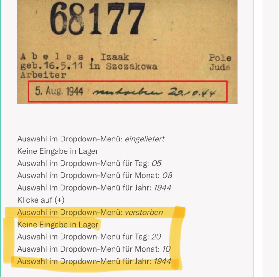Wenn auf der Karte angegeben ist, dass der Gefangene verstorben ist, ist das Todesdatum angegeben. Soll man dann bei Ort “Buchenwald” eingeben, da die Karte aus der Kartei Buchenwald ist, oder das Feld “Ort” freilassen? Vielen Dank für eure Hilfe…