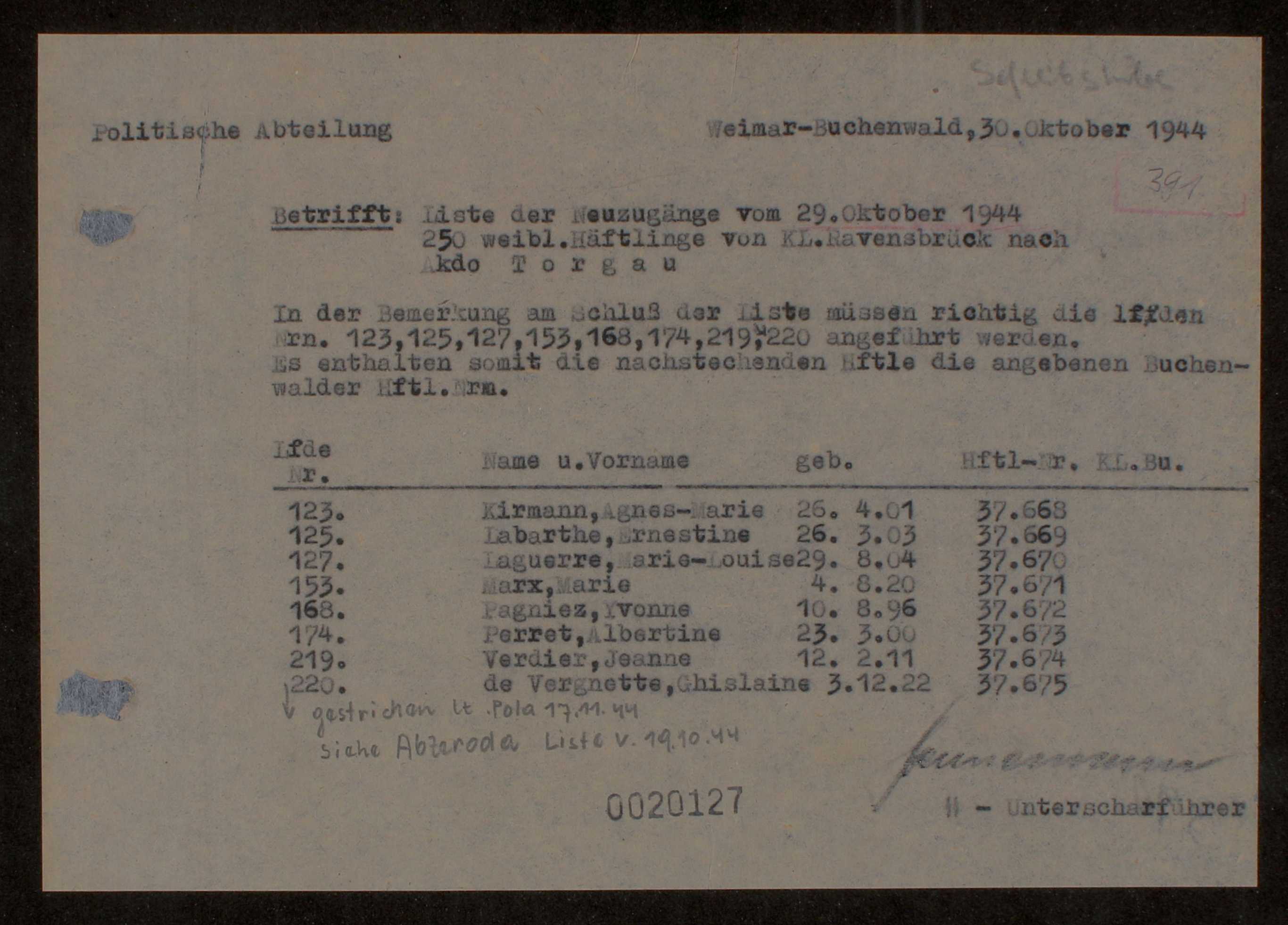 For example, her name appears on this list of arrivals / Neuzugänge in Buchenwald on 29.10.1944 (from Ravensbrück and on to the Torgau Labor Camp), as well as in the two corrections by the Political Department(Polit. Abtlg.)