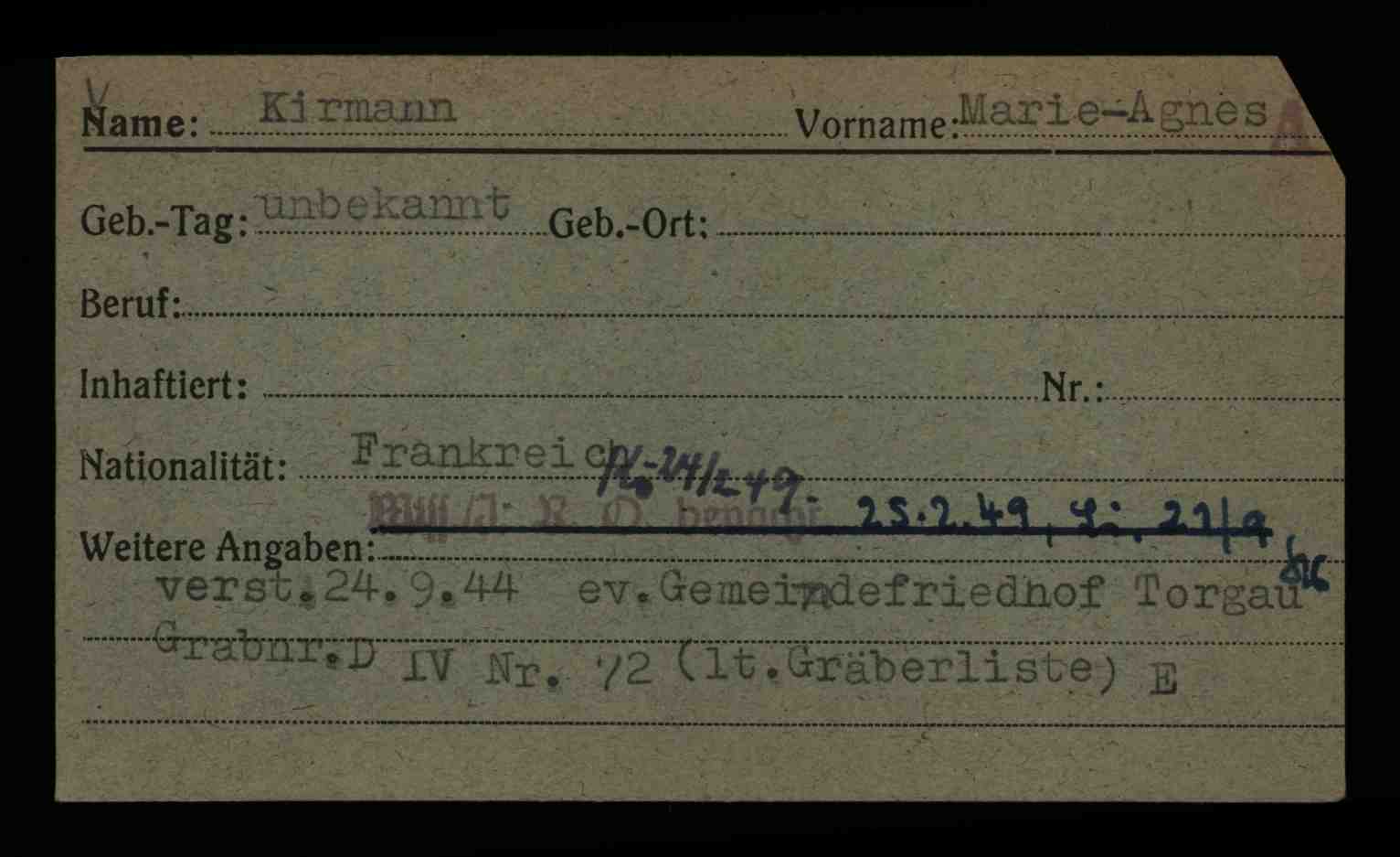Es scheint, dass M. Kirmann tatsächlich bereits am 24.09.1944 in Torgau verstarb und dass sie dort am 26.09.1944 beerdigt wurde, siehe hier and hier.