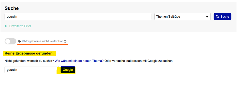 The same entry in „erweitert / advanced search mode“: → Keine Ergebnisse/No results. – (provided KI / AI is deactivated or the filter is set to „Neueste / Latest“.)